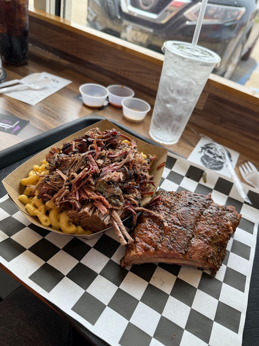 My husband and I stopped in our way through and man it didn’t disappoint!! We got the brisket on the Mac and cheese bowl and it was amazing and a 1/4 ribs to try. Then we decided to get a loaded baked potato and another Mac and cheese bowl for the next day and the potato had a wonderful smoked flavor . Can’t wait to come back and try something else